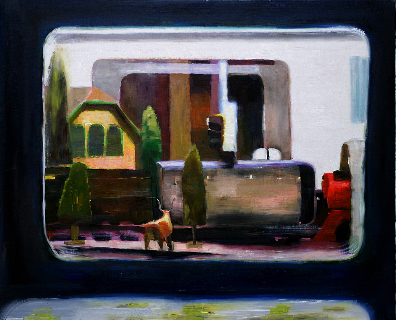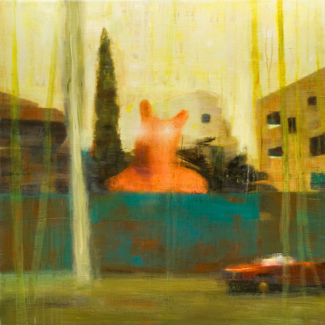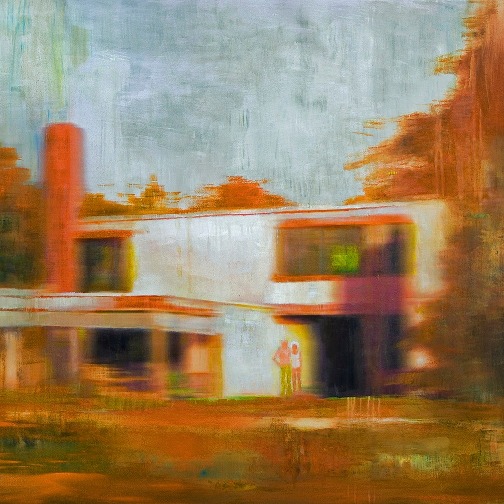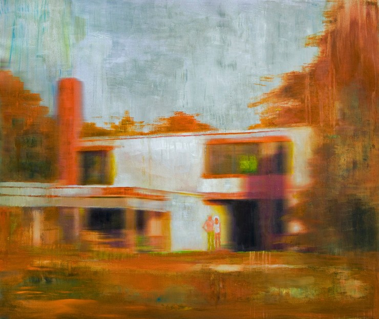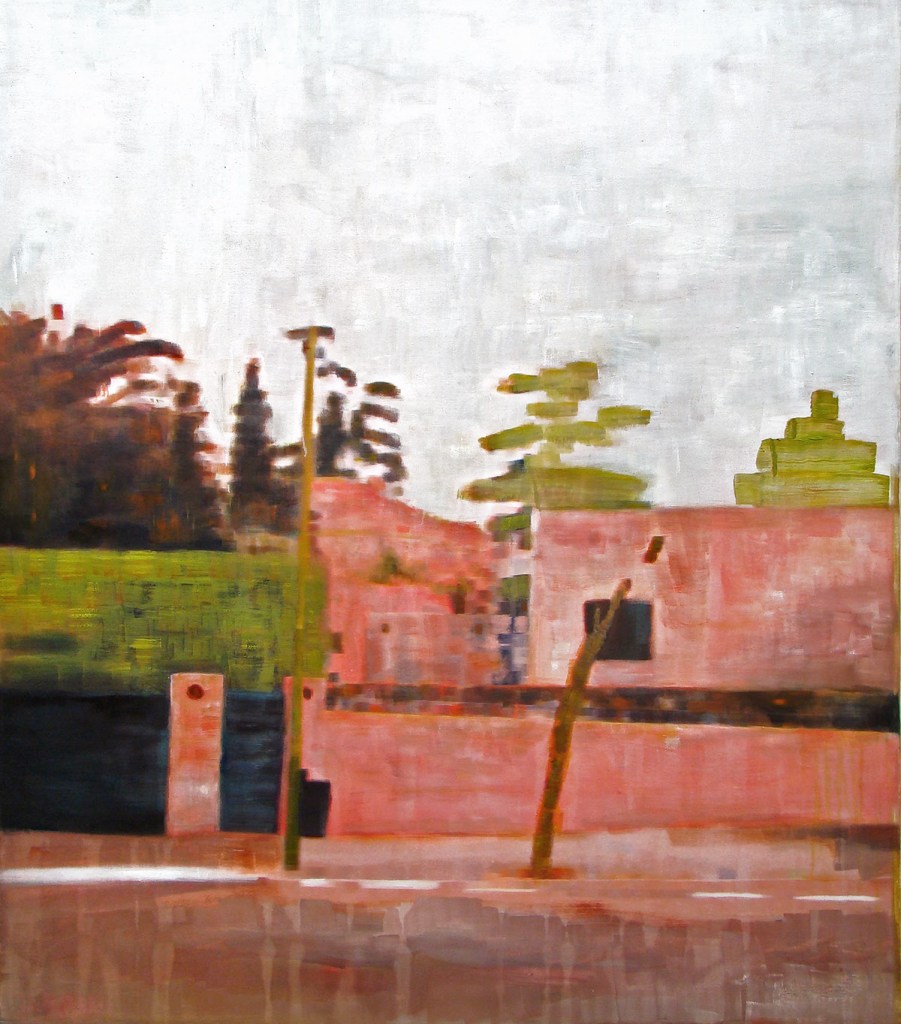 PROPIEDAD PRIVADA series of paintings depicts the formal tension between geometrical architectures and organic surroundings. Large fine houses are seen in motion, as if the watcher was rushing past. These are the thresholds of private properties: anything happening beyond the fence is no longer visible. No civics here, thank you!