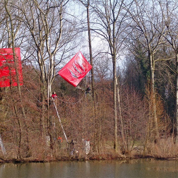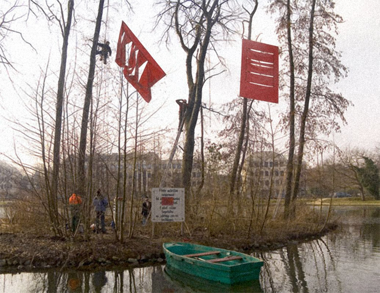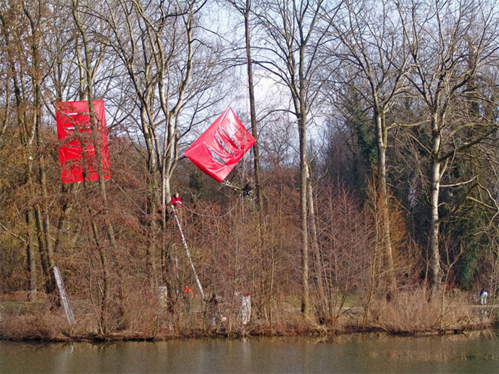 Le 8 mars 2006, à l’intérieur d’ une des îles du Parc Malou, trois grands rectangles en monochrome rouge sont introduits, fixés dans le respect de la nature. Un ordre humain est inséré par la présence étrangère des trois bâches: objets idéels qui composent formes et séries géométriques, une couleur plate et plan unique. Cet ensemble épuré sera en tension avec la surabondance formelle de la nature.