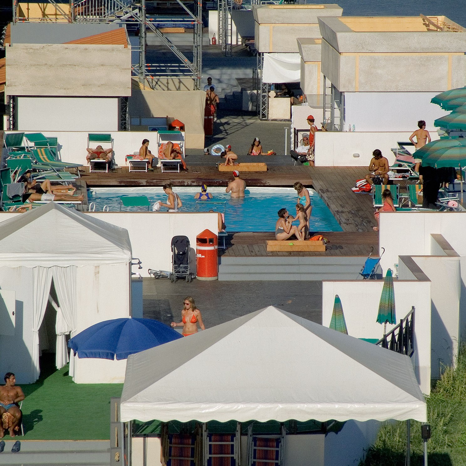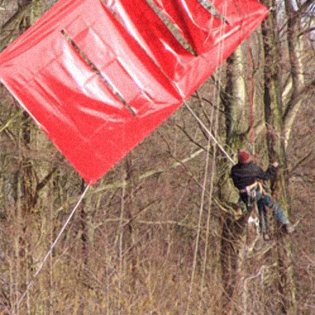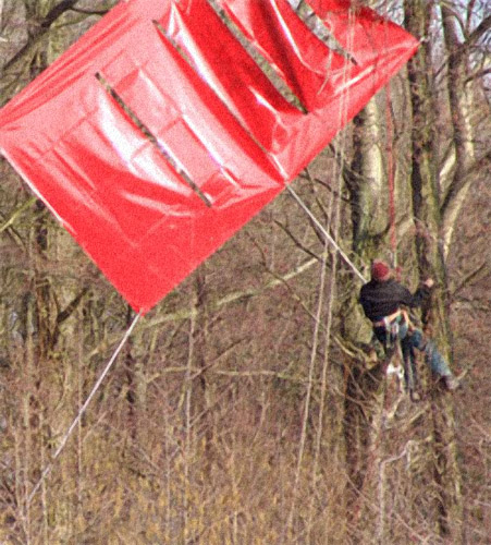 Des incisions transversales et parallèles sont réalisées dans les bâches. Ces entailles opèrent, à la fois, comme solution mécanique à la force exercée par le vent, autant que comme seuils-fenêtres à la nature. Celle-ci, vue de face à travers ces nombreuses lignes parallèles qui sont les incisions, se dévoile par de fortes contraposti, paires complémentaires nature-artefact : vert-rouge, organique-géométrique, mouvement bio rythmique–mouvement synchronique.