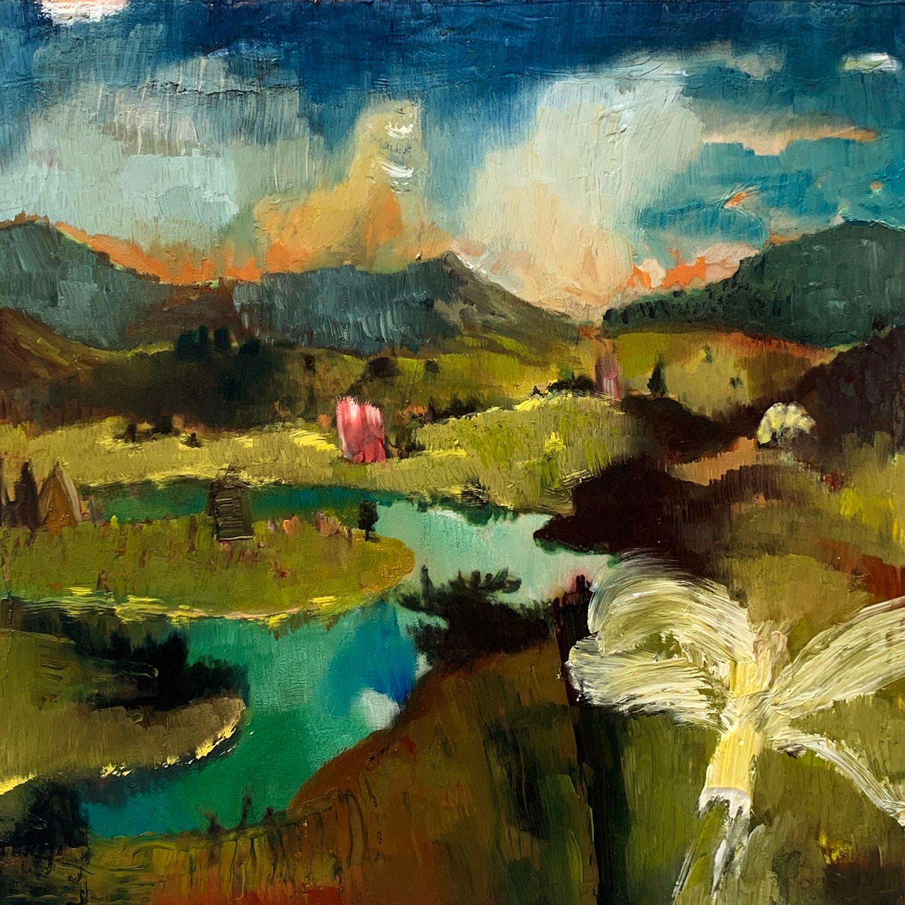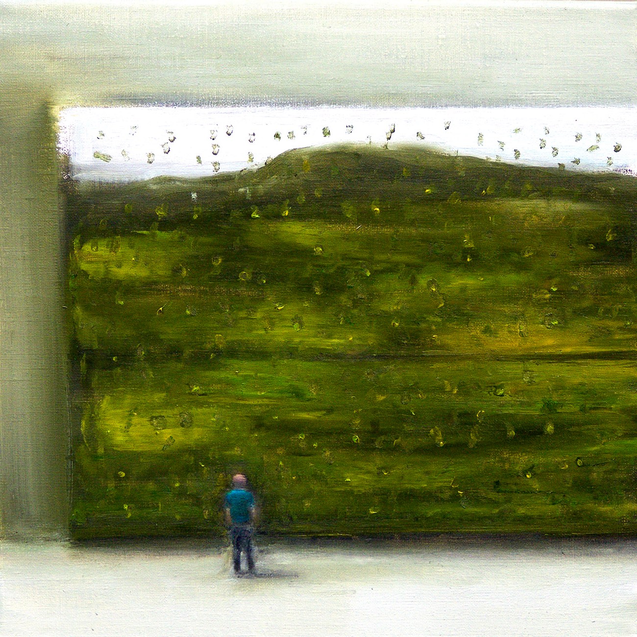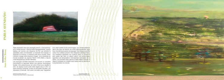 Pablo Avendaño situe ses paysages entre le « road-painting» et le « thriller pictural ». Dans sa série Topographismes, chaque tableau est comme une séquence de film qui entraîne lespectateur dans une traversée. La traversée d’un espace, la traversée d’un temps. La distance entre deux mondes. Notre mémoire voyage entre plusieurs images : de La traversée du monde souterrain de Joachim Patinir (1515-1524) à l’œuvre cinématographique de Wim Wenders. Les paysages de Pablo Avendaño ont souvent un caractère monumental et dépouillé offrant une gamme chromatique feutrée. Une prédominance de verts et de bruns stratifie la toile. Un espace ouvert porte notre regard vers un infini. La ligne d’horizon l’emporte. Le bleu du ciel retient. Soudain, une opposition s’intercale. Une action se révèle avec l’apparition d’un objet insolite et des personnages. Leur simple présence décrit une ligne de fracture qui rompt silencieusement, sans heurt, les étendues planes du paysage. Une intrigue se profile autour d’un artefact pictural. Une intégration plastique floue, une installation éphémère aux couleurs vives, un cheval en plein galop figé dans un glaçon géant. Les personnages apportent une temporalité à l’atmosphère insondable de la scène. Ce contraste entre nature et objet entend indiquer le rapport complexe qui s’établit sans cesse entre la peinture et la représentation du monde.