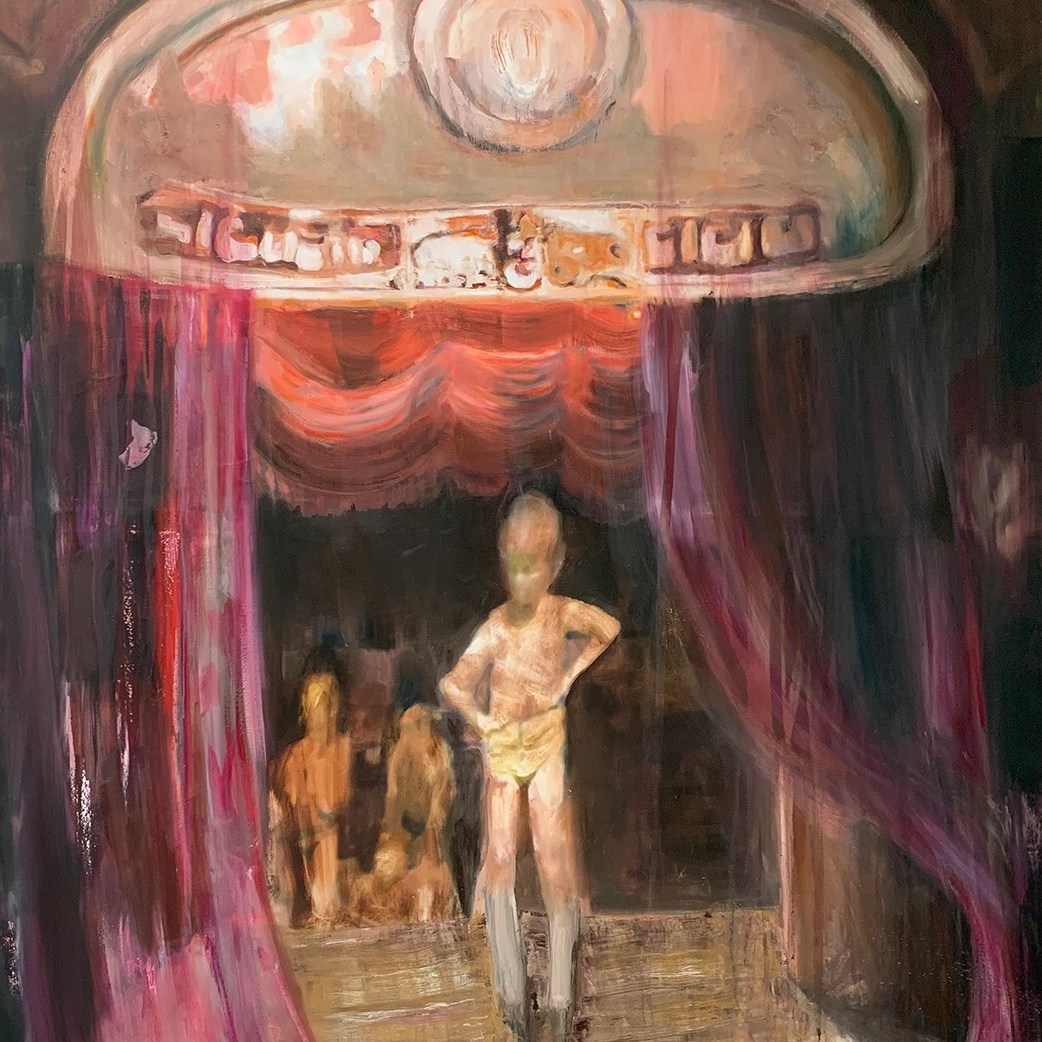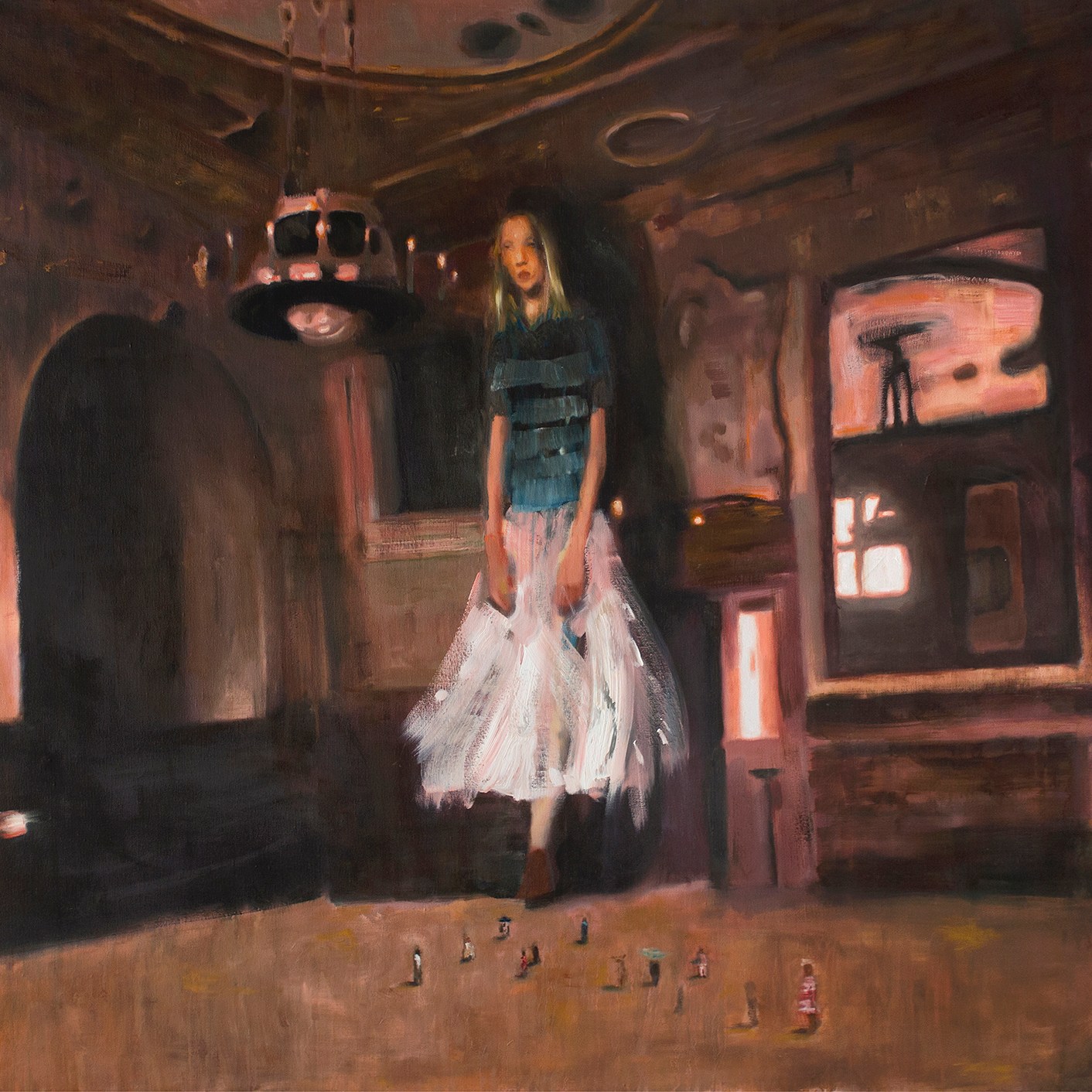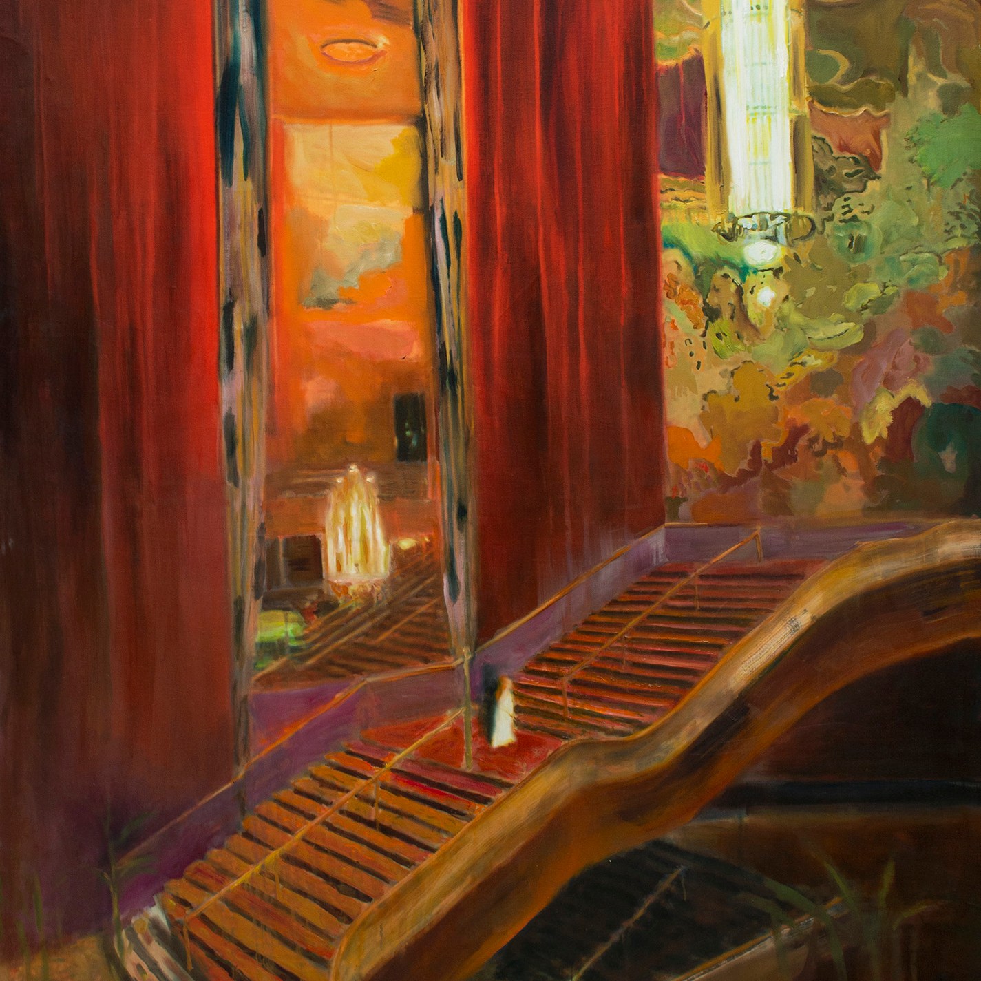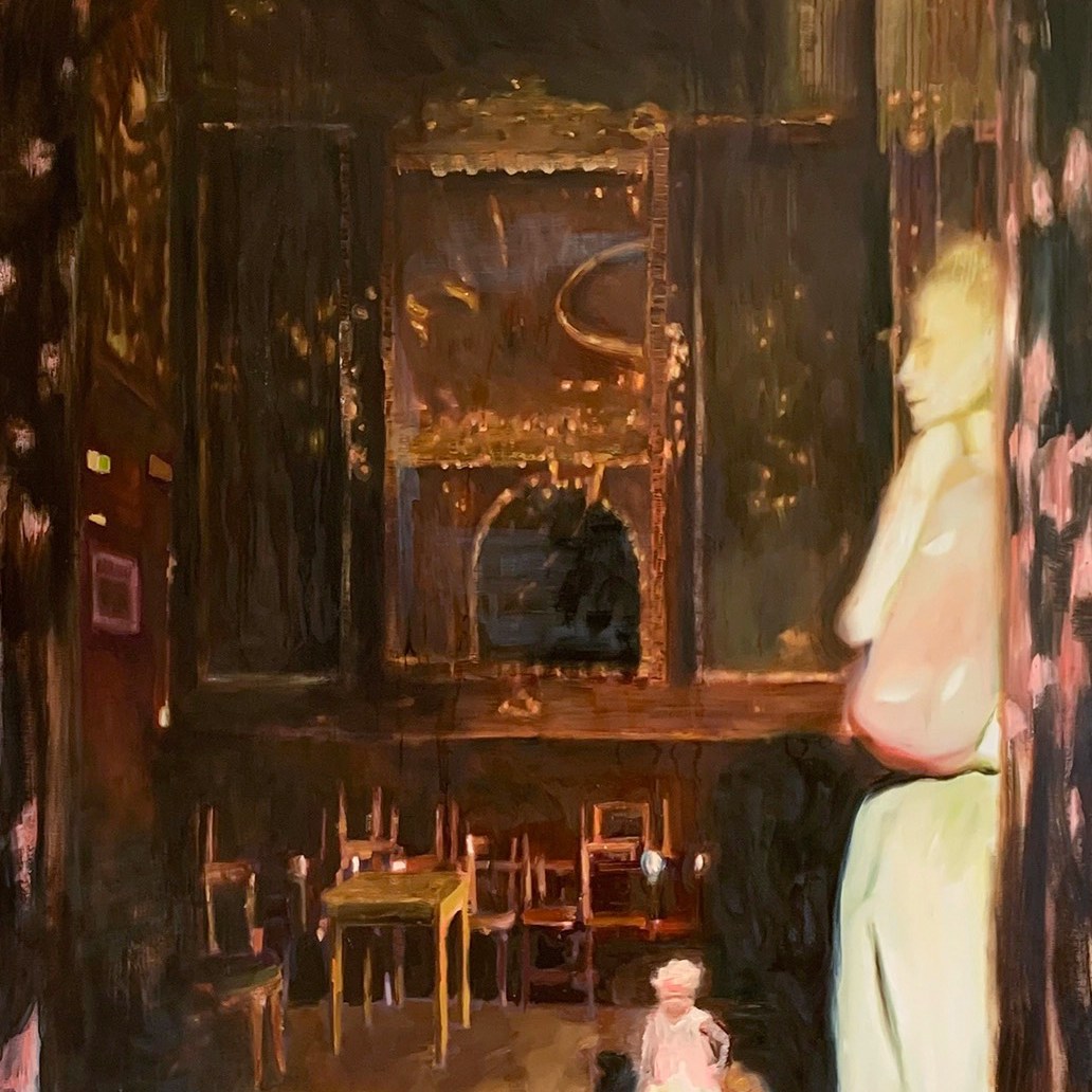 NO MATCHES FOUND is a series of monumental paintings depicting blurred and suspenseful connections between characters and the places they dwell. Following the logics of my previous series “Plot”, I aim for narratives on a fixed image. Something is definitely going on, something recent or imminent. The places are old theaters and palace interiors, rather “Vieille École” (Clärchens Ballroom in Berlin, the Grand Foyer at the Radio City music Hall in NY…) Venues associated to crowds and lively situations, however depicted “after the event”, now calm and filled with those past and tumultuous moments; thus, charged with meanings. The sumptuousness and decadence play an important role, something between nostalgia, elegance and thrill. In doing so, I chose a rather baroque palette this time, based on the classic masters “subterranean gold”, glittering all over the surface of the canvas. I add new layers, I play on scenography and I play with scales. Characters are mainly too large for those interiors. Other tiny characters work as a “cortège”. The idea of scales aberration defies the hierarchy of conventional perception or the “ideal balance”.