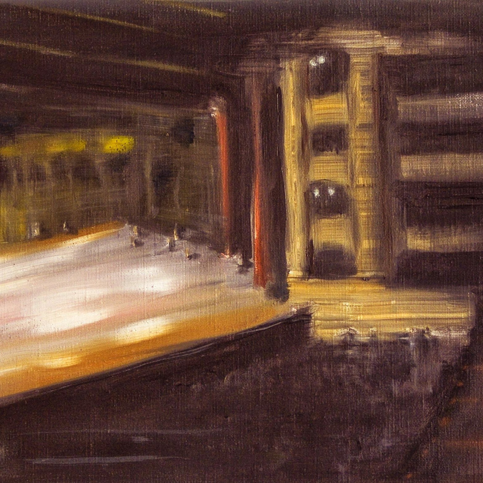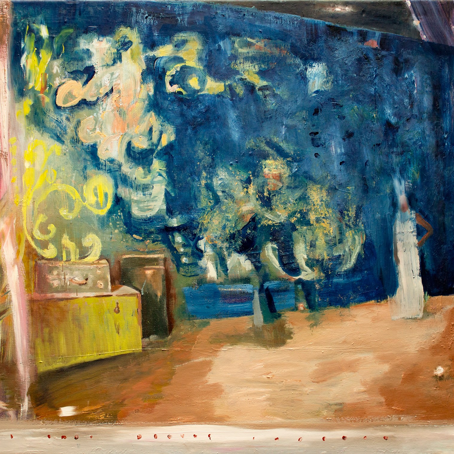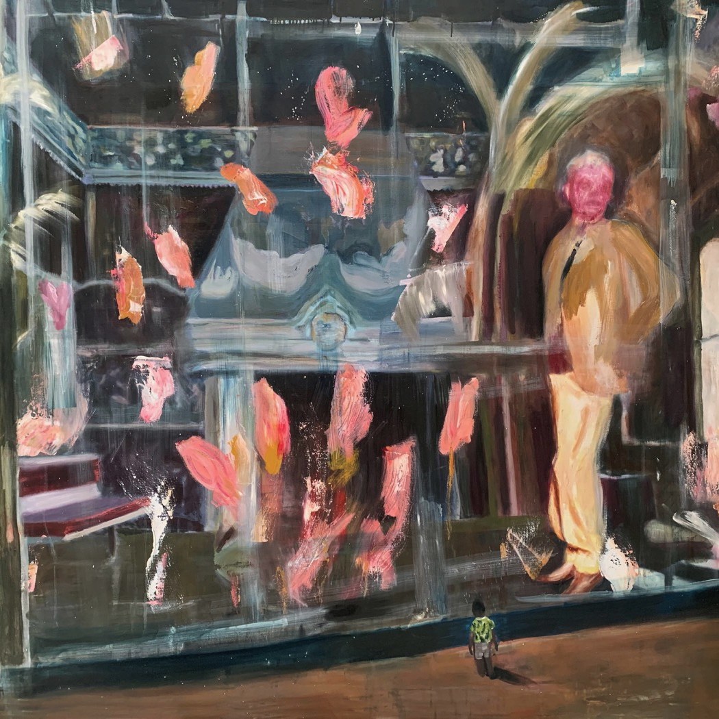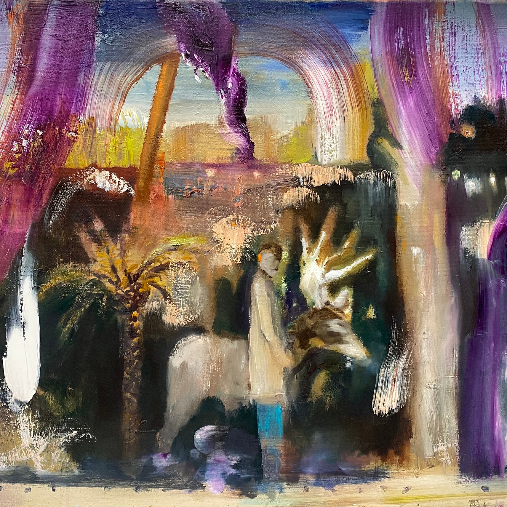 NO MATCHES FOUND is a series of monumental paintings depicting blurred and suspenseful connections between characters and the places they dwell. Following the logics of my previous series “Plot”, I aim for narratives on a fixed image. Something is definitely going on, something recent or imminent. The places are old theaters and palace interiors, rather “Vieille École” (Clärchens Ballroom in Berlin, the Grand Foyer at the Radio City music Hall in NY…) Venues associated to crowds and lively situations, however depicted “after the event”, now calm and filled with those past and tumultuous moments; thus, charged with meanings. The sumptuousness and decadence play an important role, something between nostalgia, elegance and thrill. In doing so, I chose a rather baroque palette this time, based on the classic masters “subterranean gold”, glittering all over the surface of the canvas. I add new layers, I play on scenography and I play with scales. Characters are mainly too large for those interiors. Other tiny characters work as a “cortège”. The idea of scales aberration defies the hierarchy of conventional perception or the “ideal balance”.